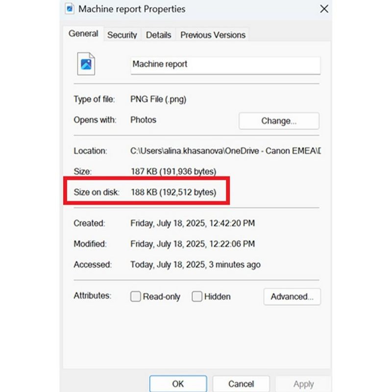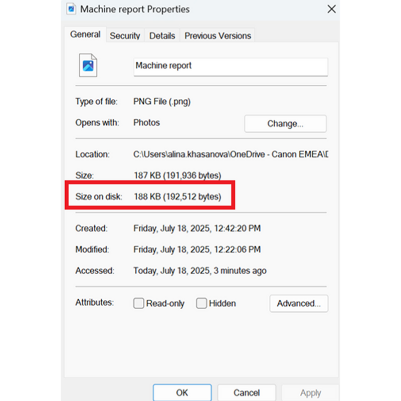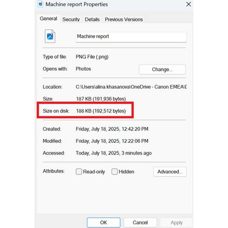 To check the size of the file (Windows), locate the receipt on your computer, right click on the file and select ‘Properties’. The file size is listed under the 'General' tab as highlighted below.