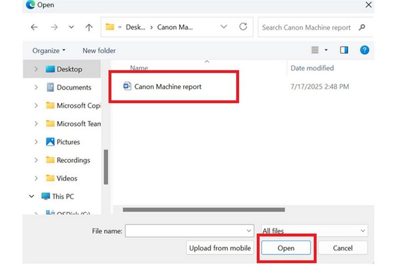 f. Select the file and click ‘Open’ to confirm your selection